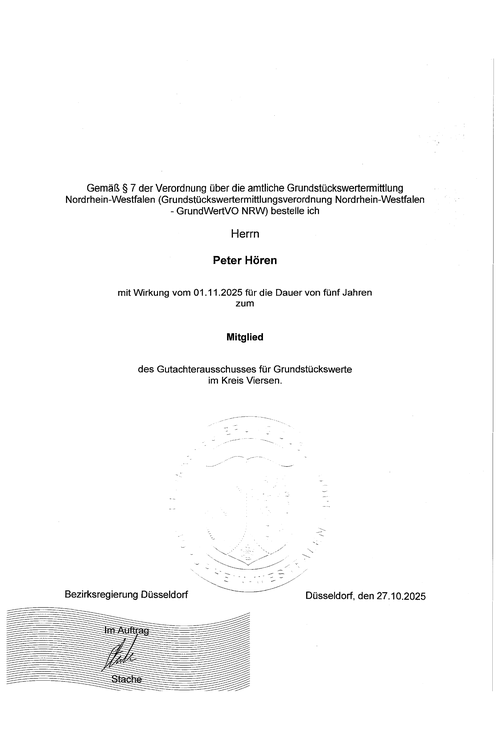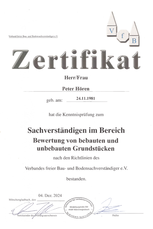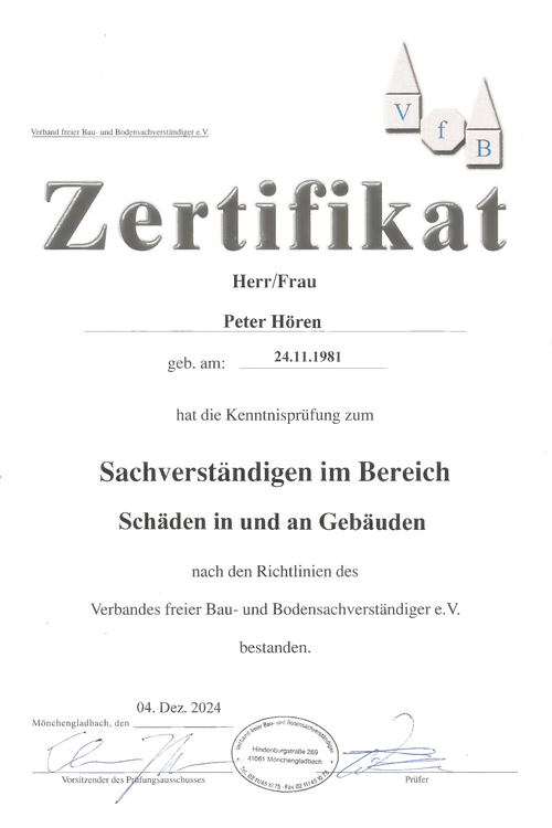 AUSGEZEICHNET Basierend auf 14 Bewertungen Gepostet auf Stefan Corda-ZitzenTrustindex überprüft, ob die Originalquelle der Bewertung Google ist. Als gemeinnützige Einrichtung können wir Herrn Hören bestens weiterempfehlen. Herr Hören hat stets ein offenes Ohr, auch für Details, ist sehr kompetent, zuverlässig und gleichzeitig flexibel. Dazu ist Herr Hören aus sehr angenehme Art sehr freundlich. Fazit: Jederzeit wieder!Gepostet auf Jennifer GolaTrustindex überprüft, ob die Originalquelle der Bewertung Google ist. Wir können den Bausachverständigen Peter Hören uneingeschränkt weiterempfehlen. Vom ersten Kontakt an war er absolut zuverlässig, kompetent und jederzeit ansprechbar. Während des gesamten Hausbaus unseres Reihenhauses hat er uns mit seiner Fachkenntnis begleitet und uns ein wirklich gutes und sicheres Gefühl. Wir haben uns bei ihm jederzeit bestens aufgehoben gefühlt und sind sehr dankbar für seine Unterstützung und dies auf eine sehr freundliche und sympathische Art. Vielen Dank für die hervorragende Betreuung – wir würden Herrn Hören jederzeit wieder beauftragen!Gepostet auf Jonas MeisterTrustindex überprüft, ob die Originalquelle der Bewertung Google ist. Klare Empfehlung – äußerst kompetent und zuverlässig Herr Peter Hören hat uns bei unserem Neubau-Reihenhaus-Projekt in Viersen-Dülken während der gesamten Bauzeit und bei den einzelnen Abnahmen hervorragend unterstützt. Mit seinem sehr genauen Blick für Details hat er potenzielle Mängel frühzeitig erkannt und uns stets fachlich fundiert, verständlich und unabhängig beraten. Gerade bei den Abnahmen haben wir uns durch seine strukturierte und professionelle Vorgehensweise sehr sicher gefühlt. Rückblickend war die Beauftragung von Herrn Hören eine der besten Entscheidungen im gesamten Bauprojekt. Uneingeschränkt empfehlenswert für alle, die Wert auf Qualität und eine ehrliche Baubegleitung legen.Gepostet auf Greta BondariTrustindex überprüft, ob die Originalquelle der Bewertung Google ist. Wir empfehlen die Dienstleistungen von Herrn Hören von ganzem Herzen. Bei einem Wasserschaden hatten wir eine negative Erfahrung, und er war die einzige Person, die uns während des gesamten Prozesses zuverlässig unterstützt und jederzeit kompetent beraten hat. Er arbeitet eng mit seinen Kunden zusammen und ist dabei stets freundlich und professionell. Wir würden jederzeit wieder auf ihn zurückkommen, falls wir einen Sachverständigen in diesem Bereich benötigen.Gepostet auf CasterdesasterTrustindex überprüft, ob die Originalquelle der Bewertung Google ist. HBS ist ein sehr kompetentes und strukturiertes Unternehmen. Wir hatten monatelang Probleme mit unangenehmen Gerüchen, lediglich in nur einem Raum. Keiner konnte uns sagen woher dieser Geruch kommt und was man dagegen tun kann. Herr Hören hat in Zusammenarbeit mit etablierten Unternehmen das Problem ausfindig gemacht und uns bei den Sanierungsmaßnahmen professionell begleitet. Seither gibt es keine unangenehmen Gerüche mehr.Gepostet auf X XTrustindex überprüft, ob die Originalquelle der Bewertung Google ist. Wir haben Herrn Peter Hören für die Bewertung einer Wohnung beauftragt – und sind mehr als begeistert. Seine Expertise, sein geschultes Auge und seine ruhige, verständliche Art haben uns nicht nur enorm weitergeholfen, sondern uns auch vor erheblichen Folgekosten bewahrt. Herr Hören arbeitet äußerst gründlich, erklärt jeden Schritt nachvollziehbar und gibt klare, praxisnahe Empfehlungen. Man merkt sofort, dass hier ein echter Fachmann am Werk ist, der die Interessen seiner Kunden in den Mittelpunkt stellt. Vielen Dank für die hervorragende Unterstützung! Wir würden ihn jederzeit wieder beauftragen und uneingeschränkt weiterempfehlen.Gepostet auf Jessica PflipsenTrustindex überprüft, ob die Originalquelle der Bewertung Google ist. Herr Hören ist ein äußerst kompetenter und zuverlässiger Bausachverständiger! Schneller Termin, gründliche Begutachtung und eine klare schriftliche Beurteilung mit hilfreichen Empfehlungen. Wir fühlen uns bestens beraten - vielen Dank! Uneingeschränkte Weiterempfehlung.Gepostet auf Ines BoosTrustindex überprüft, ob die Originalquelle der Bewertung Google ist. Herr Hören kann ich nur weiter empfehlen. Er war sehr freundlich am Telefon und hat sich meinem Schimmelproblem sofort angenommen. Innerhalb einer Woche wurde ein Termin vereinbart, um das Problem im Haus zu beseitigen. Hierbei ging er professionell vor und hat mich sehr gut beraten. Vielen Dank für die schnelle Hilfe und die freundliche professionelle Beratung.Gepostet auf Ali CankayaTrustindex überprüft, ob die Originalquelle der Bewertung Google ist. Herr Hören arbeitet äußerst professionell, zuverlässig und strukturiert. Die Begutachtung und Bewertung der Immobilie wurde zügig, gründlich und nachvollziehbar durchgeführt. Besonders positiv hervorzuheben ist die klare und fundierte Darstellung von Sanierungsbedarf, Zustand und Marktwert. Auch Rückfragen wurden zeitnah und kompetent beantwortet. Insgesamt eine sehr hilfreiche und vertrauenswürdige Dienstleistung – absolut empfehlenswert für alle, die eine fundierte Einschätzung einer Immobilie benötigen.